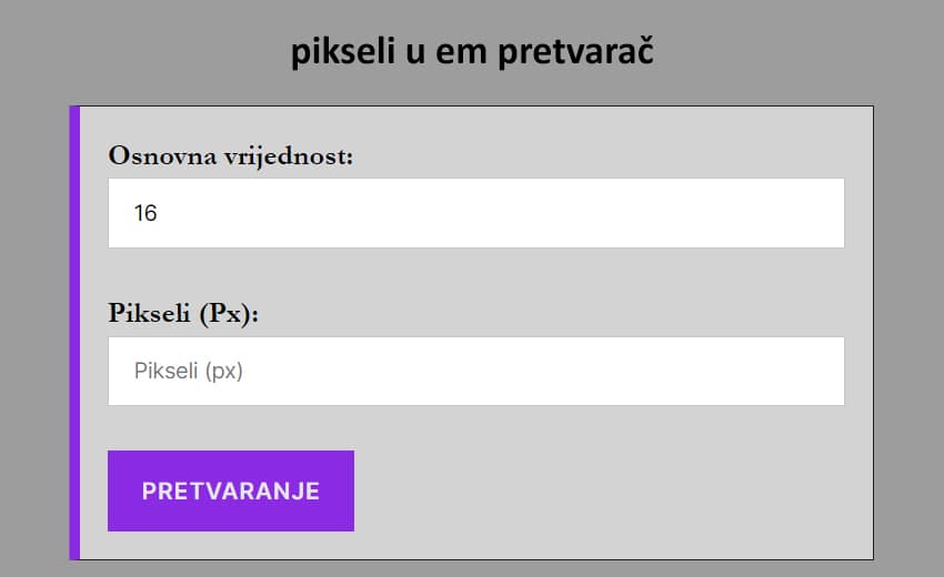 Za ručno pretvaranje px u em možete koristiti ovu jednačinu: