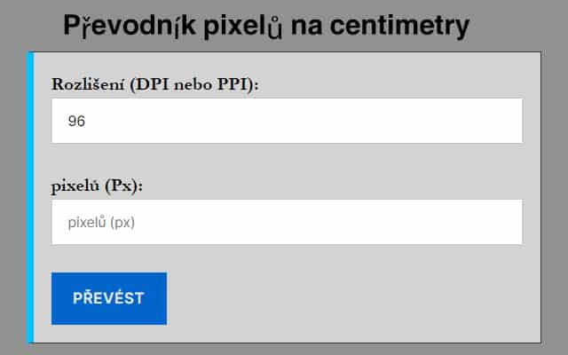 1 palec = 2,54 centimetrů a rozlišení = 96 pixelů/palec = 96 pixelů/2,54 centimetrů, tedy 1 pixel = 2,54 centimetrů/96 = 0,02645833333 centimetrů.