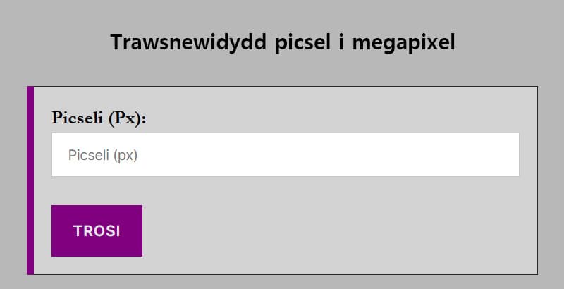 Mae hwn yn gyfryngwr ar-lein y gallwch ei ddefnyddio i drosi picsel (px) i megapixels (mp). Mae megapixel yn un miliwn picsel, ac fe’i defnyddir yn gyffredin i ddisgrifio nifer y picsel mewn delwedd a lefel ansawdd y delwedd.