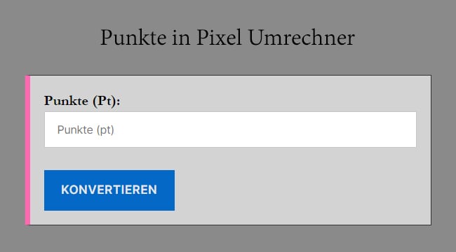 Dies ist ein einfacher Online-Konverter, mit dem Sie Punkte (pt) in Pixel (px) konvertieren können. Geben Sie den Punktwert (pt) ein, den Sie in Pixel (px) konvertieren möchten, und klicken Sie auf die Schaltfläche Konvertieren!