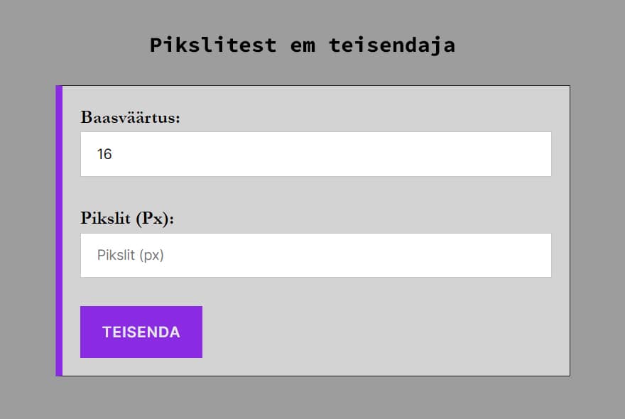 Px teisendamine em-ks on väga lihtne. Nagu ma eespool mainisin, on em teksti suhteline ühik, mis tähendab, et 1 em on samaväärne teksti suurusega, olenemata emakomponendi teksti suurusest.