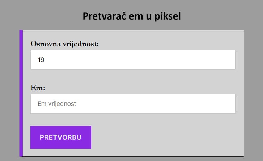 Najbolji način za pretvaranje Em u px je korištenje gornjeg mrežnog pretvarača.