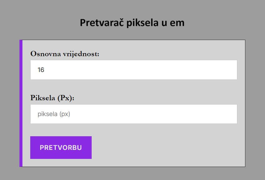 Za ručno pretvaranje px u em možete koristiti ovu jednadžbu: