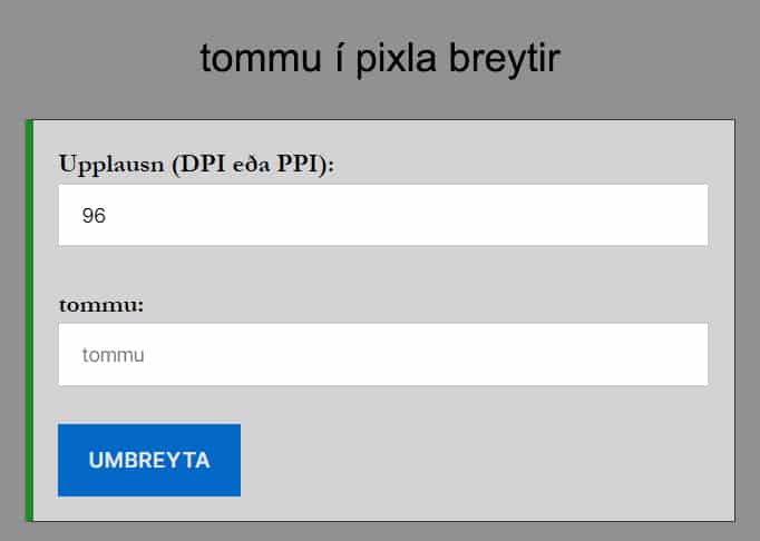 Til dæmis, ef tommur=16 og upplausnin=96, þá verða pixlar=16*96=1536.