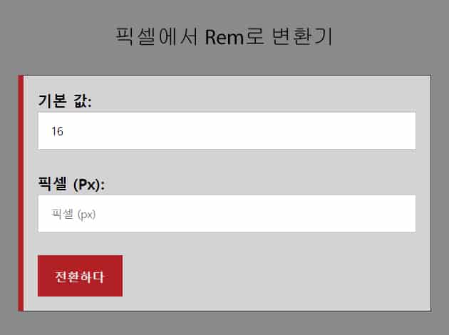 기본 크기가 16인 경우 픽셀에서 Rem 변환 표