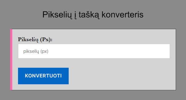 Tai nemokamas ir lengvai naudojamas keitiklis, kurį galite naudoti norėdami konvertuoti pikselius (px) į taškus (pt). Įveskite pikselių (px) reikšmę, kurią norite konvertuoti į taškus (pt), ir spustelėkite mygtuką Konvertuoti!