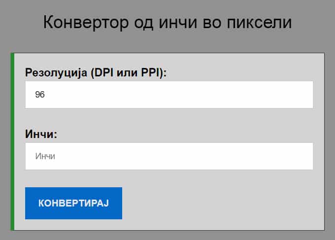 Ова обично се потребни резултати за конверзија на инч во px ако резолуцијата е 96