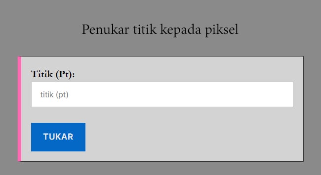Ini adalah penukar dalam talian dan mudah yang boleh anda gunakan untuk menukar titik (pt) kepada piksel (px). Masukkan nilai titik (pt) yang ingin anda tukar kepada piksel (px) dan klik pada butang Tukar!