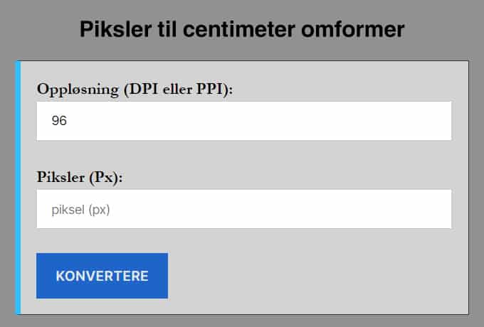 Piksel til centimeter konverteringstabell for 96 dpi oppløsning