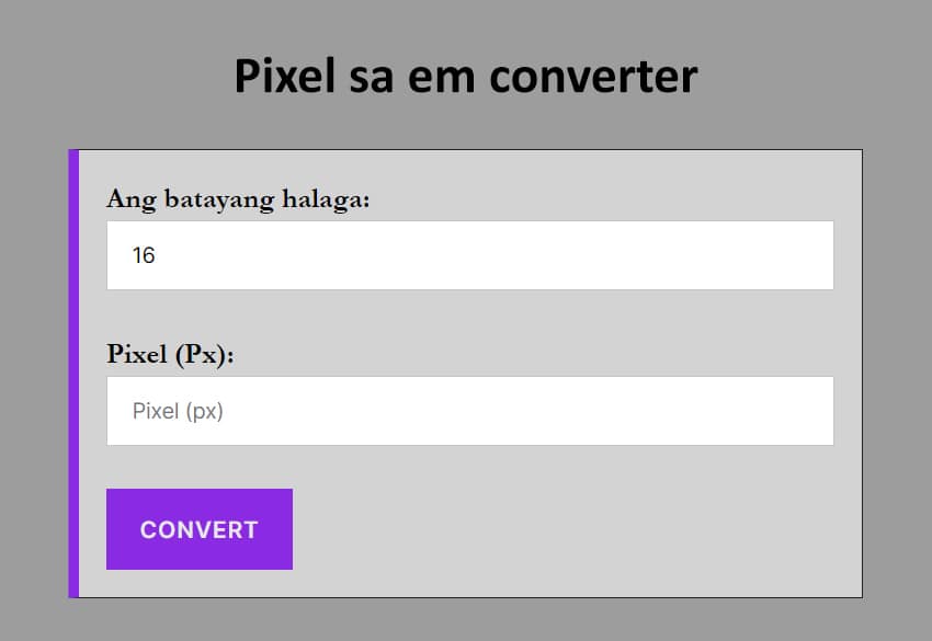 Ang pixel sa em converter ay isang libreng online converter na maaari mong gamitin upang i convert ang pixels (px) sa em. Ang converter na ito ay nagbibigay-daan sa iyo upang i-convert ang px sa em madali!