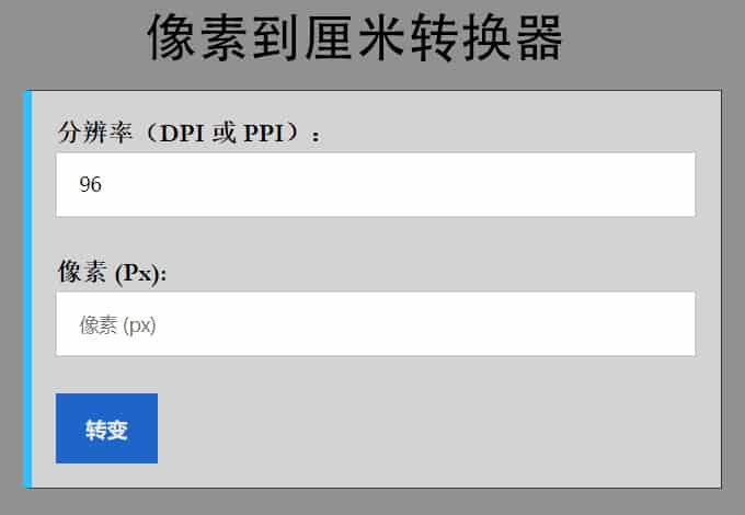 这很容易! 我们知道 1 英寸 = 2.54 厘米,所以如果分辨率(每英寸点数 DPI 或每英寸像素数 PPI)等于 96,这意味着我们每英寸有 96 个像素! 所以: